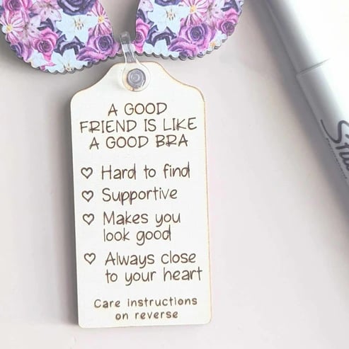 Design: Wooden hanger ornament with a cute bra & sentimental tag.