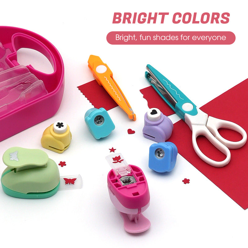 BRIGHT COLORS & NEAT STORAGE - The tools come in cheerful colors like pink, blue, yellow, and green—fun for kids and stylish for teens and adults alike. Everything fits neatly into a compact storage box, keeping punches and scissors organized and easy to carry. Take it to craft gatherings, workshops, or anywhere without worrying about losing pieces.